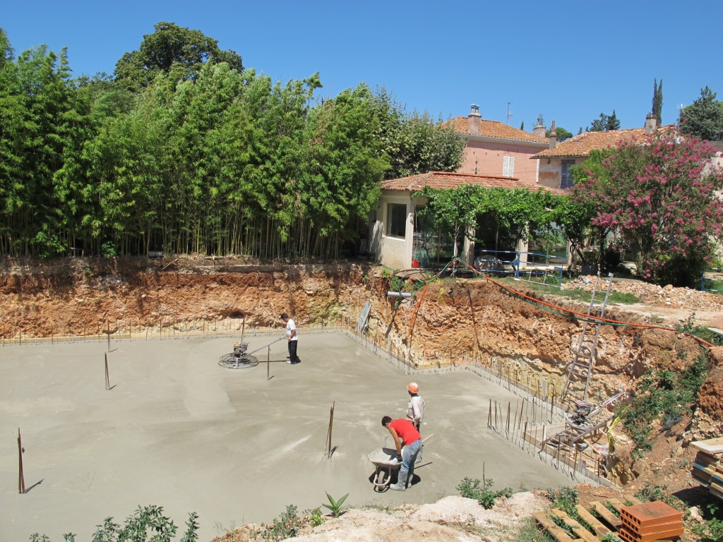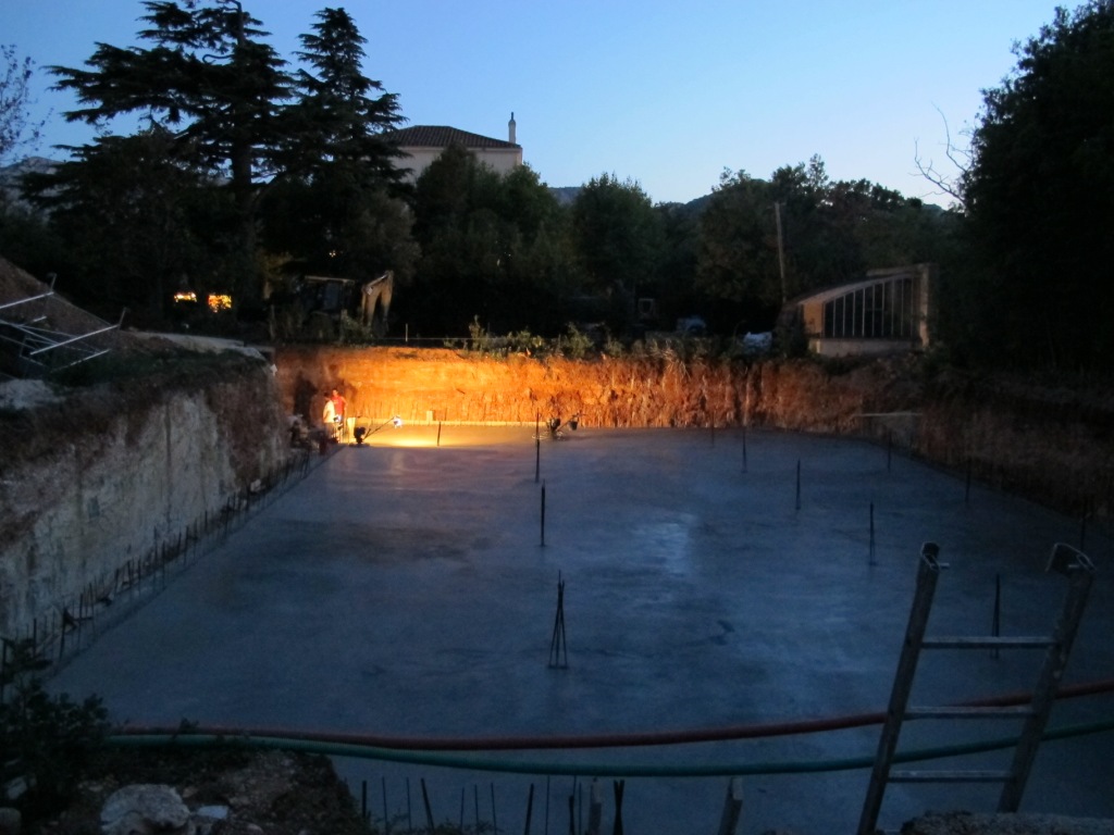 L’équipe des dallagistes (des portuguais aux mains d’or) est présente, ce sont les meilleurs (ils effectuent le chantier du stade vélodrôme….! c’est pour dire), et une rude journée les attend…. on finira la dalle à la nuit noire sous lampes… à 22h30!!